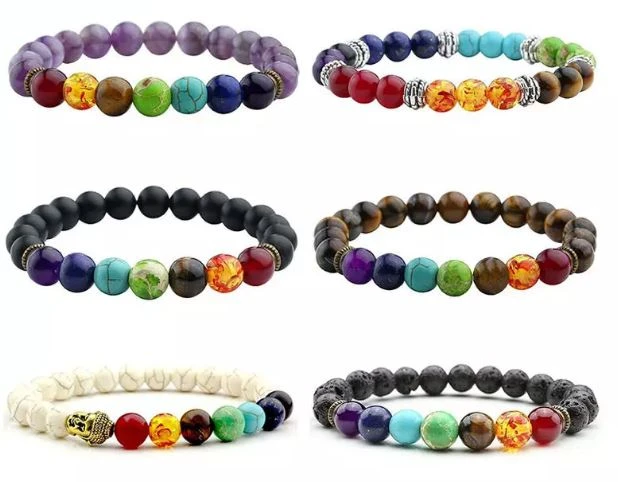 Bracelet des 7 chakras de guérison avec des pierres semi-précieuses et de lave.