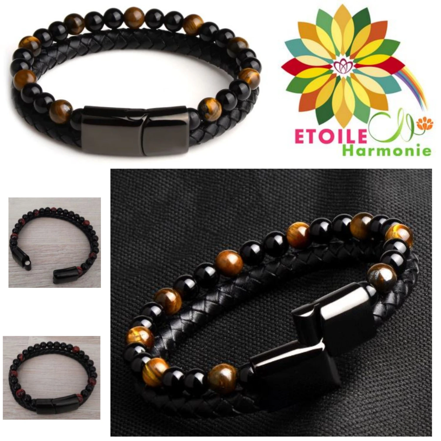 Bracelet double magnètique oeil de tigre avec des perles de 6mm et fait en pierre naturel de perles d’œil de tigre et un bracelet en cuir véritable en acier inoxydable avec un fermoir magnétique.