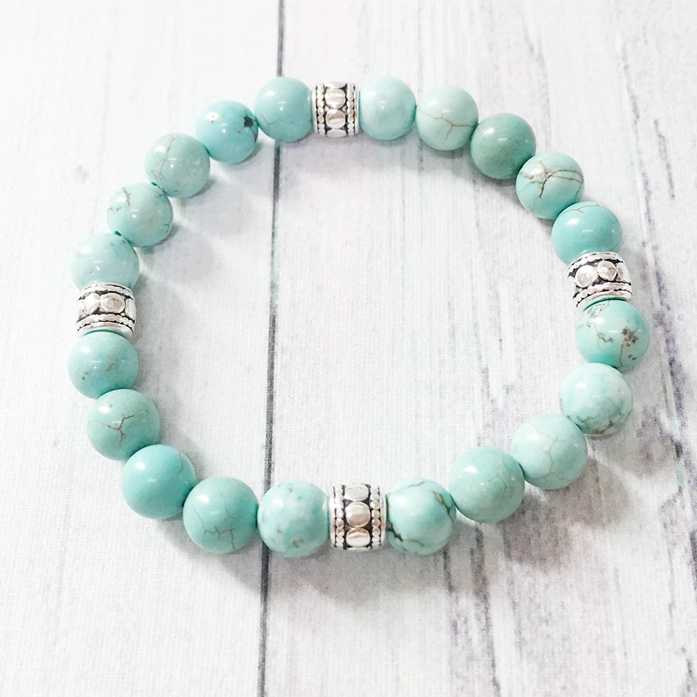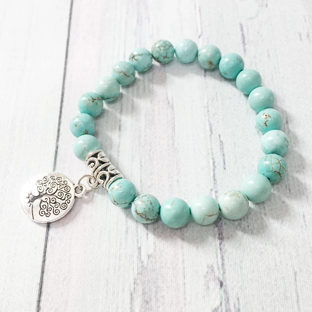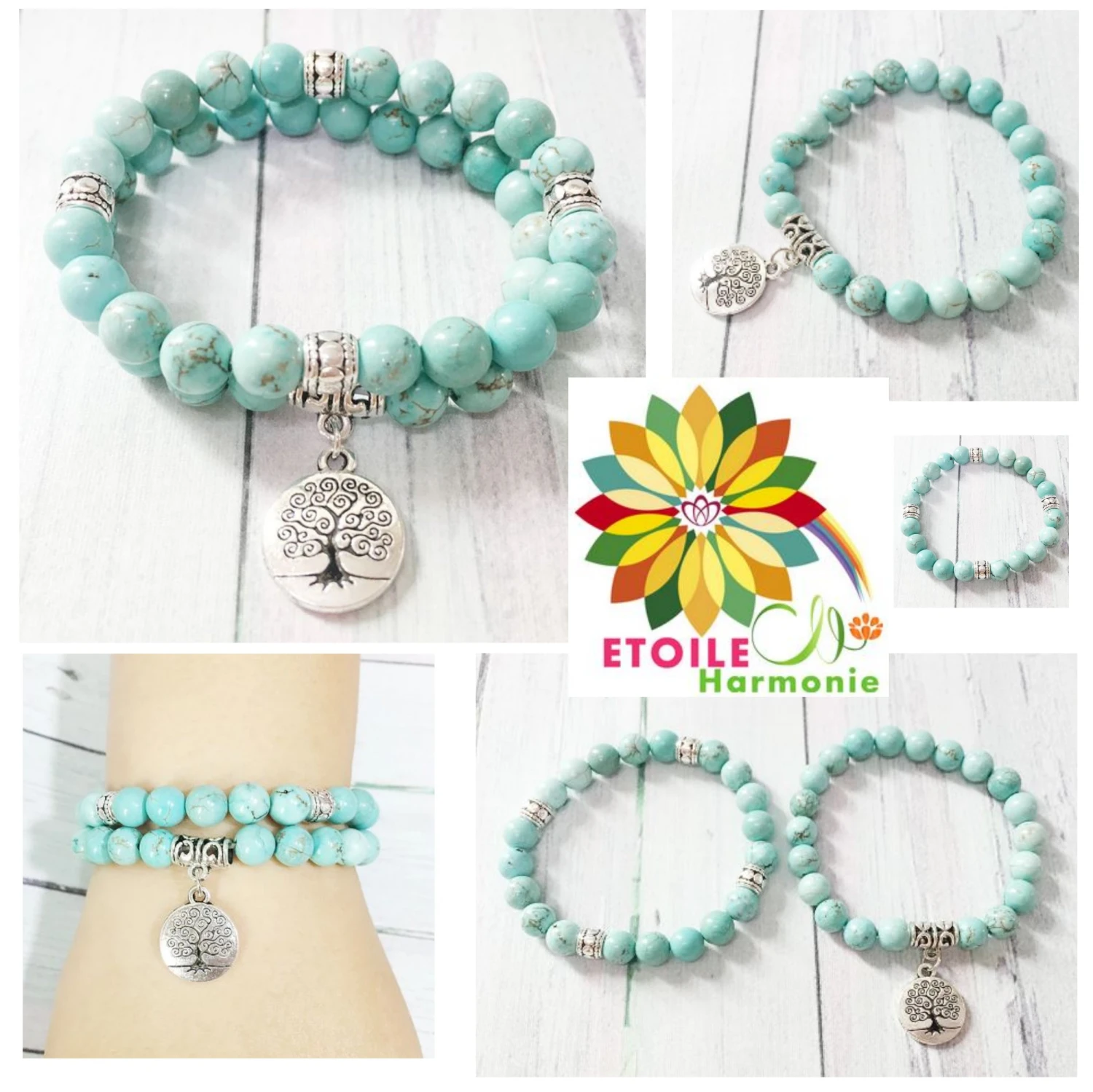 Ensemble de deux bracelets avec le symbole d’arbre de vie qui symbolise la force de vie, qui est un symbole de régénération et d’immortalité. Fait de perles de turquoise qui est connue pour être une des pierres de guérison les plus puissantes.