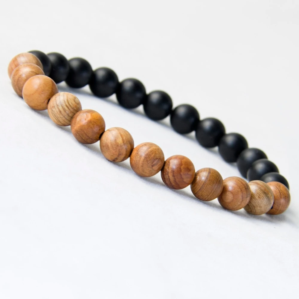 Bracelet élastique de perles en pierre onyx et en bois.