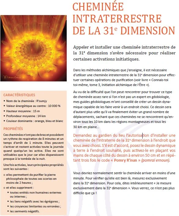 Demandez au gardien du lieu l’autorisation d’installer une cheminée de l’intraterre de la 31e dimension à l’endroit que vous avez choisi. S’il est d’accord, posez le dessin dynamique à terre à l’endroit souhaité, puis activez-le en plaçant vos mains de chaque côté du dessin à environ 50 cm et en répétant trois fois le code « Pomry R’nun » (pomraï ernoun).