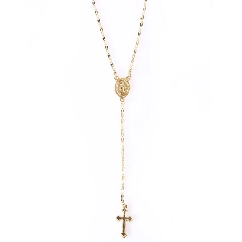 Collier imitation chapelet en acier inclus en pendentif une croix scintillante.