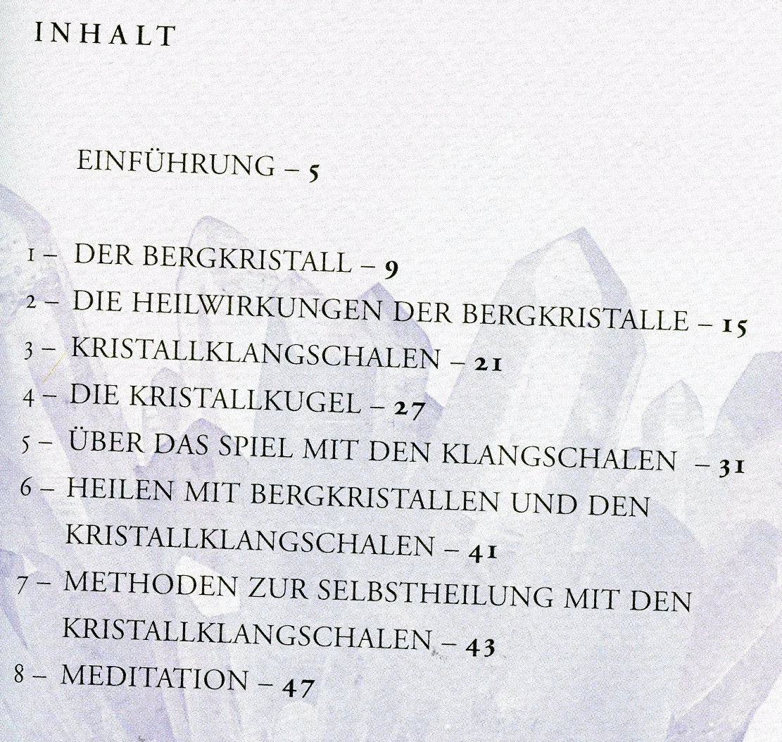 Ce livre fournit des explications (en Allemand pour cette Ă©dition) claires sur les pouvoirs particuliers du cristal de roche, et le CD joint vous permet d’expĂ©rimenter les vibrations thĂ©rapeutiques des bols chantants en cristal.