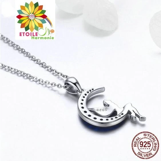 Jolie petit pendentif d’une fée en harmonie sur une demi-lune bleu en argent 925° sterling.