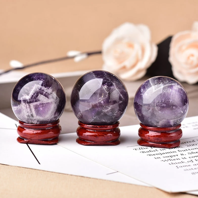 Belle petite sphère d’améthyste avec un support inclus. Diamètre de la petite sphère entre 3 à 3.5 cm environ.