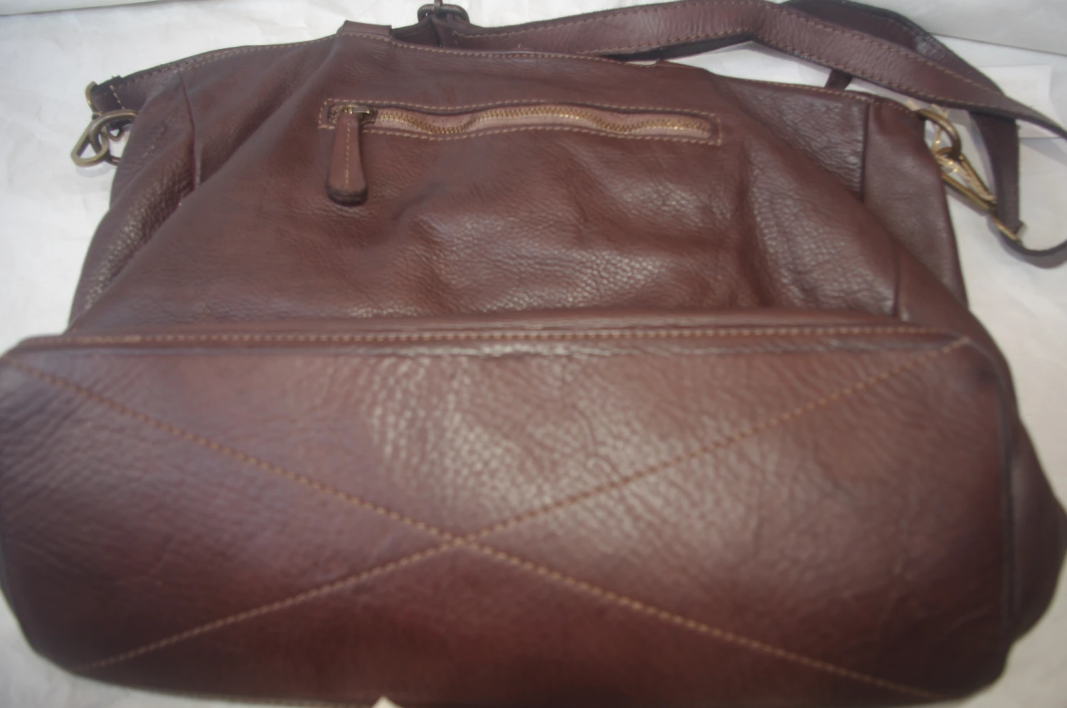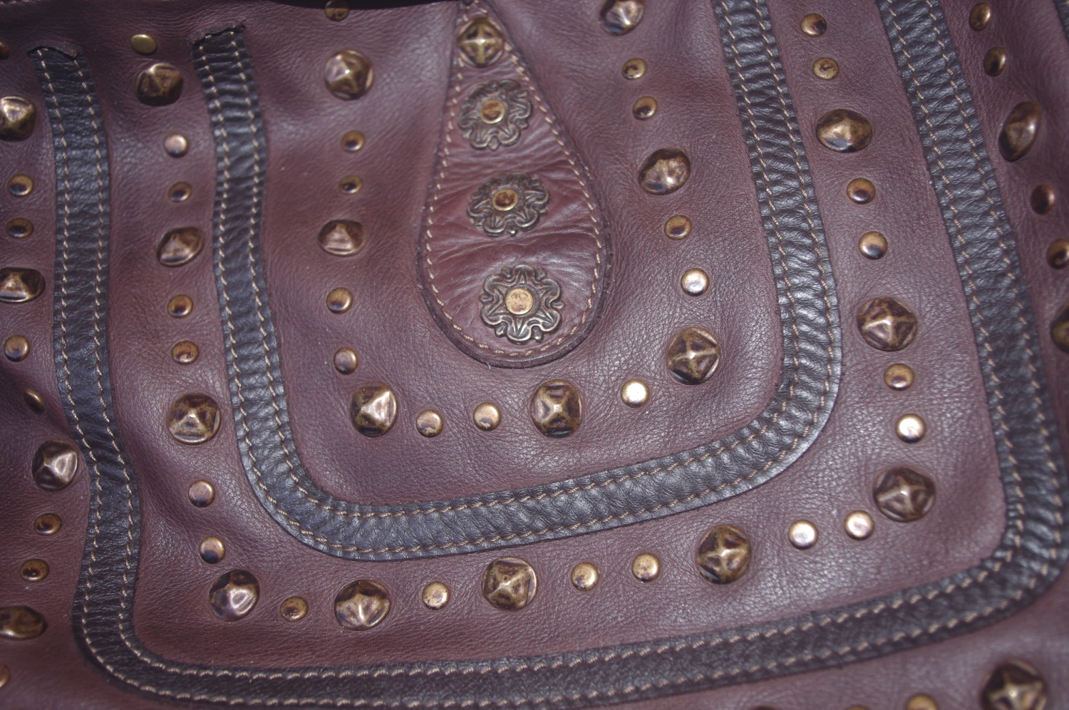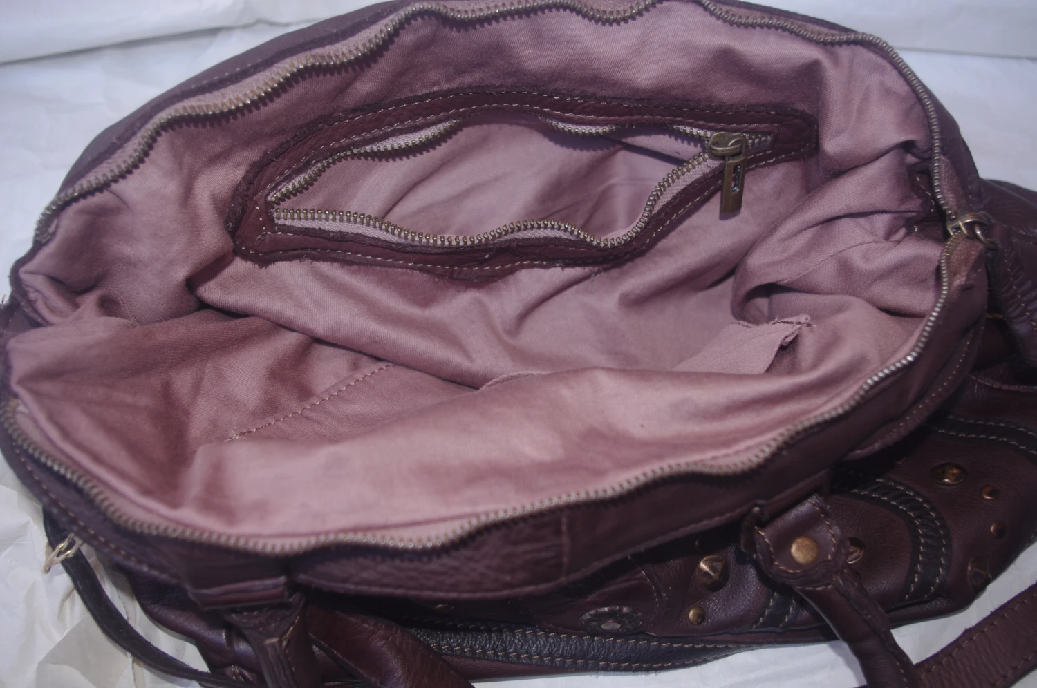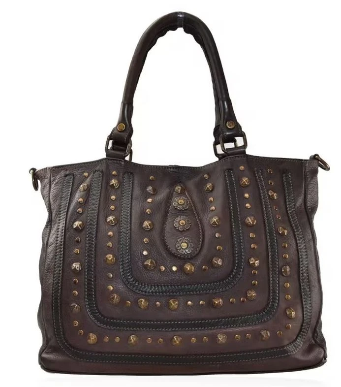 Sac à bandoulière pour femme en cuir veritable à la mode et au look vintage, clous décoratifs sur le devant, poche zippée au dos, intérieur doublé avec poches, fermeture zippée, bandoulière amovible et réglable.